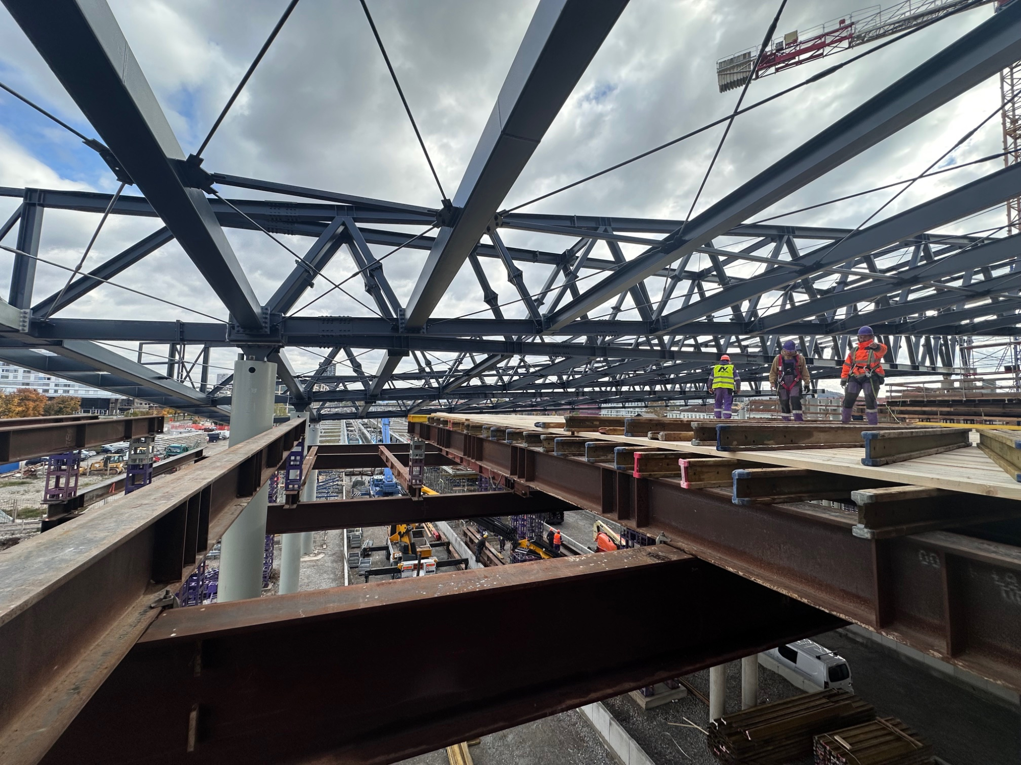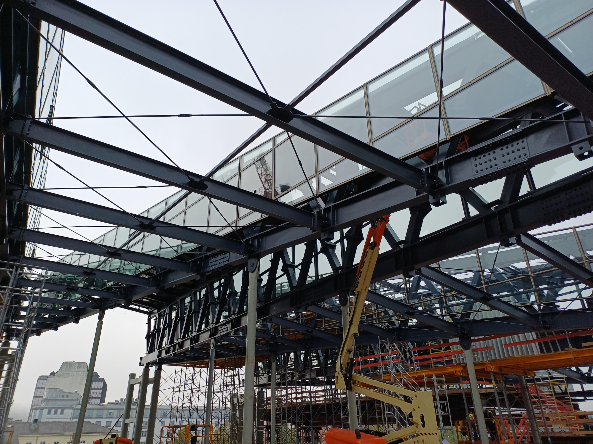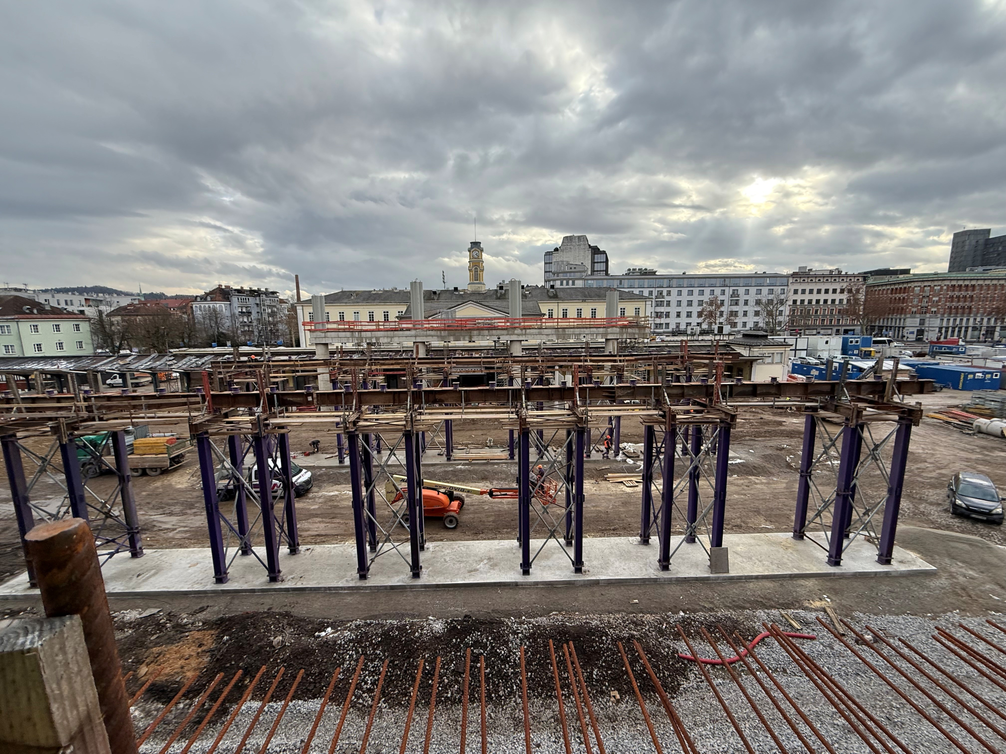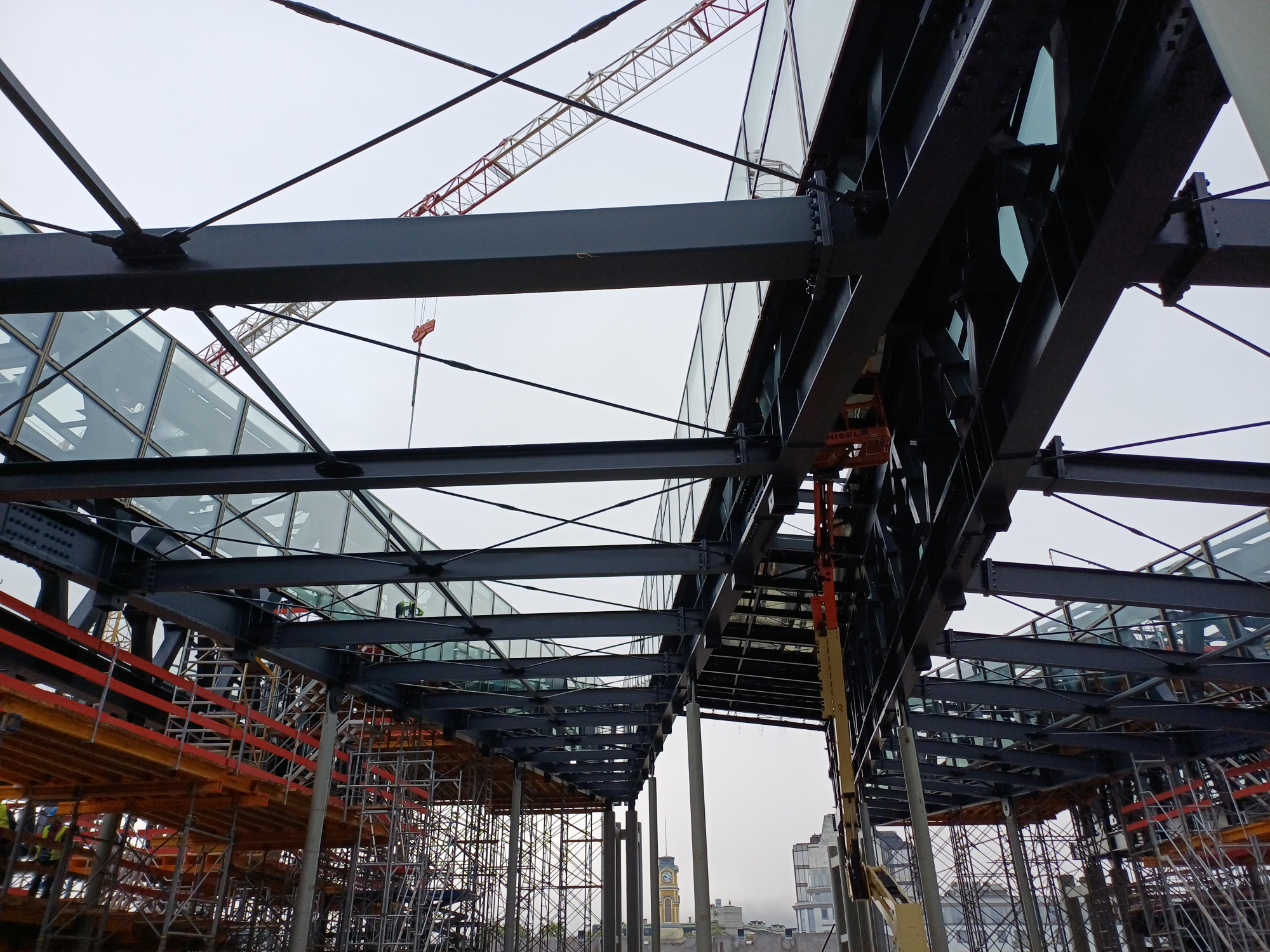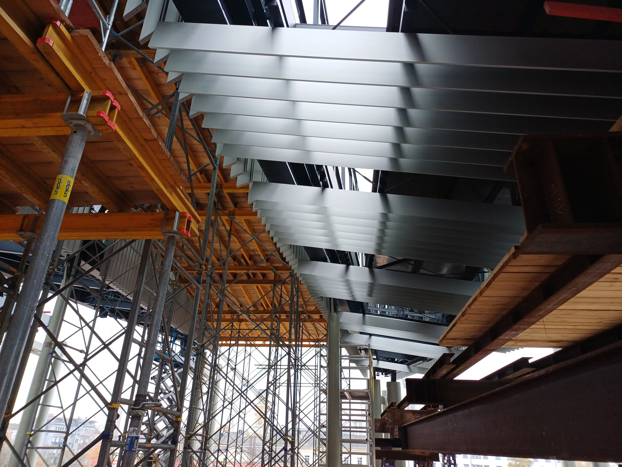 - Obsegal bo dve etaži iz jekla in montažnega betona, ki bosta viseli s strehe na jeklenih vešalkah.